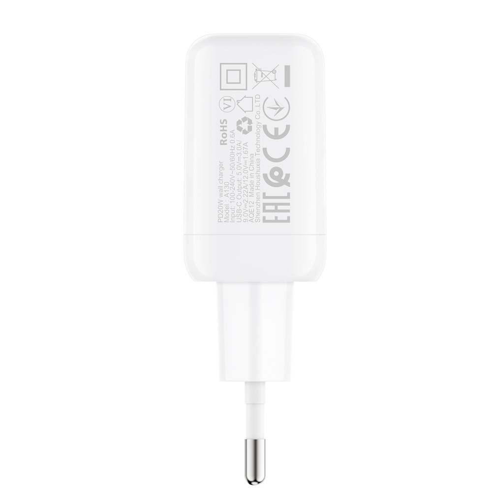 ACEFAST A130 підтримує швидку зарядку з максимальною потужністю 20 Вт через єдиний USB-C порт із вихідними параметрами: 5V⎓3A, 9V⎓2.22A, 12V⎓1.67A. Пристрій сумісний із протоколами PD, QC, FCP, AFC, що забезпечує ефективну зарядку смартфонів, планшетів та інших гаджетів. Вхідна напруга 100-240V (50/60Hz) гарантує універсальність, а інтелектуальний чип контролю температури та сертифікації CE, RoHS 2.0, EAC, ERP6 забезпечують безпеку й енергоефективність. Гарантія на 12 місяців підкреслює надійність пристрою.
