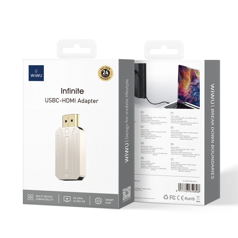 • ДизайнАдаптер WiWU Infinite HB004 виконаний із міцного алюмінієвого сплаву, що забезпечує довговічність і стійкість. З вагою 69 г і компактними розмірами він легко поміщається в кишеню чи сумку, ідеально підходячи для подорожей. Колір Titanium додає елегантного вигляду, роблячи пристрій стильним аксесуаром.