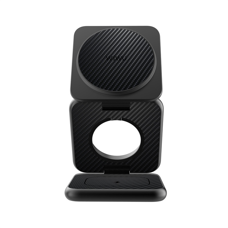 Wi-W035 виготовлений із преміальних матеріалів: алюмінієвого сплаву та Kevlar, що забезпечують надзвичайну міцність, стійкість до подряпин і довговічність конструкції. Модель виконана у стильному чорному кольорі, має мінімалістичну форму та акуратне розташування всіх зарядних платформ. Легка вага — всього 130 г — робить зарядку портативною та зручною для перенесення. Завдяки компактності й сучасному дизайну станція гармонійно виглядає на робочому столі, тумбочці чи в будь-якому інтер’єрі.