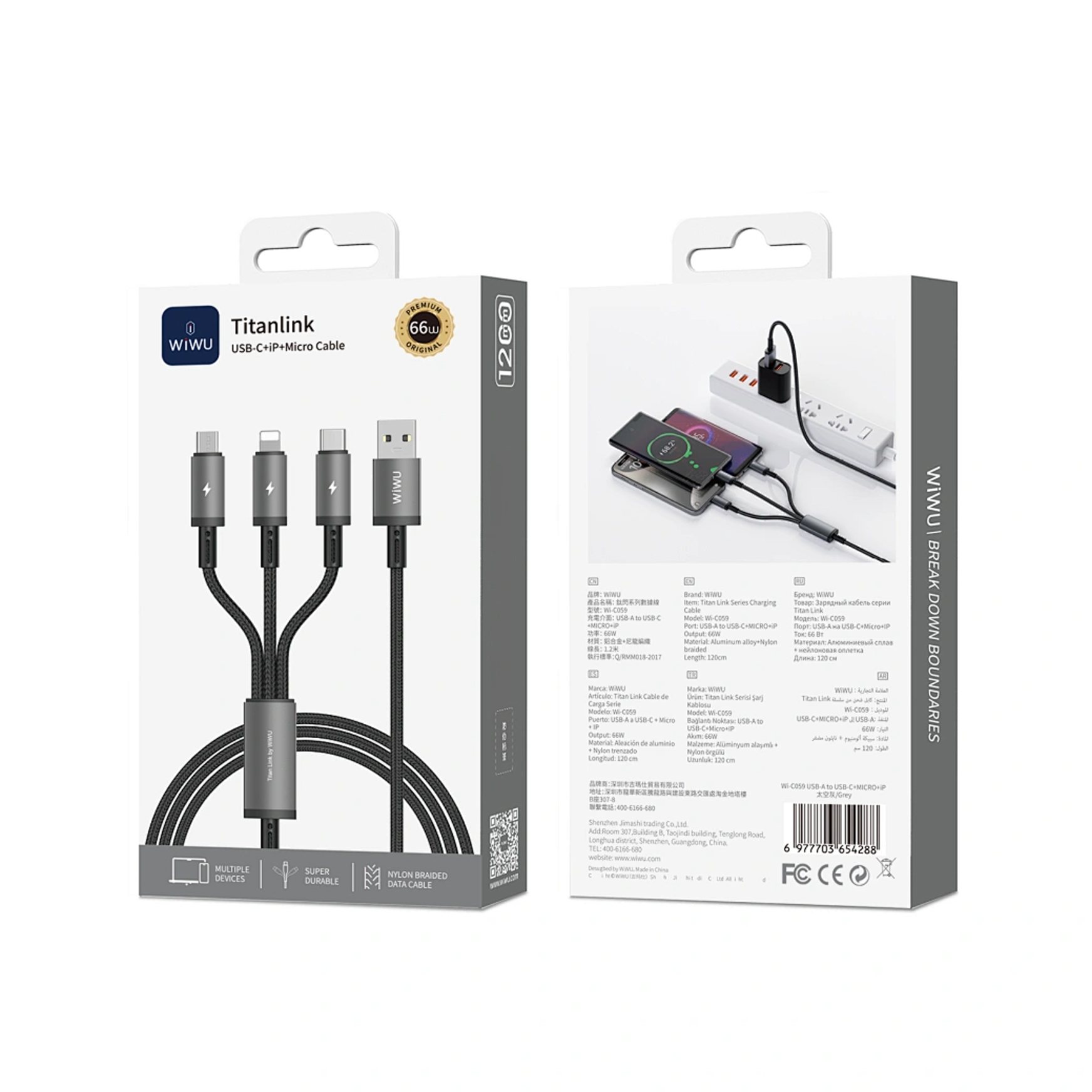 Кабель WiWU Wi-C059 поєднує сучасний стиль і високу практичність завдяки продуманому дизайну. Виготовлений із міцного алюмінієвого сплаву та нейлонового обплетення, він стійкий до зносу, розривів і сплутування, що забезпечує довговічність навіть при інтенсивному використанні. Довжина 1.2 метра робить його зручним для використання вдома, в офісі чи в подорожах. Колір Space Grey надає кабелю елегантного вигляду, а компактна конструкція з трьома роз’ємами (Lightning, USB-C, Micro-USB) дозволяє заряджати різні пристрої одним кабелем. Надійні роз’єми гарантують стабільне з’єднання та комфорт у використанні.