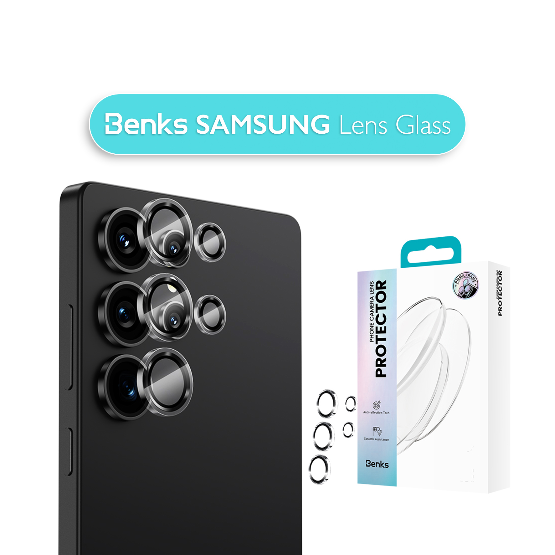 Захисне скло Benks GlassWarrior створене спеціально для камери смартфонів Samsung, забезпечуючи точне прилягання до об'єктива. Воно має прозору конструкцію з акуратними рамками, які гармонійно поєднуються з дизайном пристрою та не порушують його естетику. Матеріали — загартоване скло та прозорий акрил — забезпечують не лише захист, а й збереження оригінального вигляду камери. У комплекті додається все необхідне для акуратного встановлення: волога серветка, мікрофібра, стікери та планка для точної поклейки.